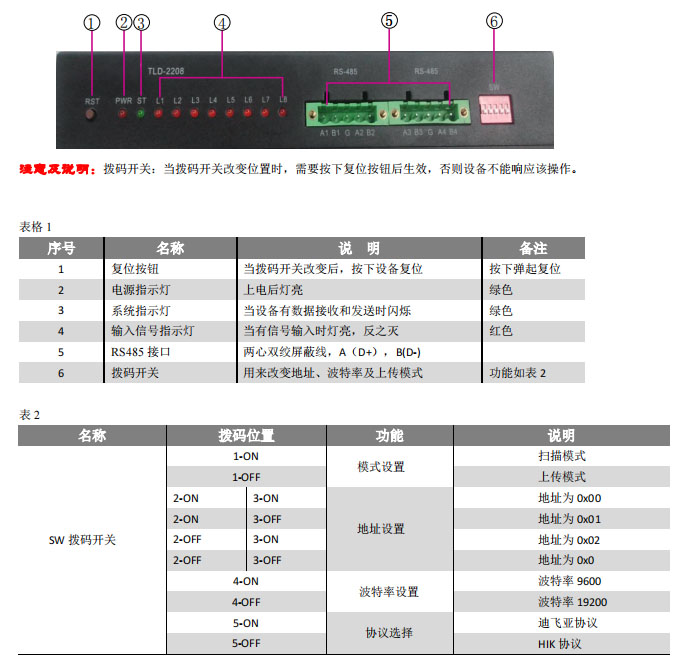 | 拨码开关 | 5路拨码开关,用来设置波特率、地址和上传模式 |